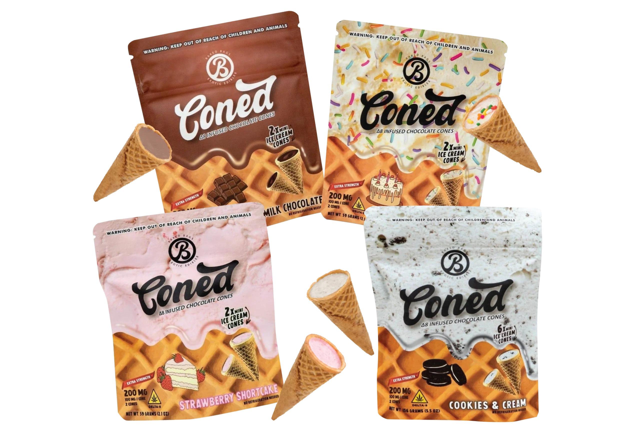 The Baked Bags Coned Variety Pack features an assortment of mini sugar cones filled with rich, THC-infused chocolate. Each pack typically includes fan-favorite flavors like Milk Chocolate, Cookies & Cream, Strawberry Shortcake, Birthday Cake, and Mint Chip, delivering a premium dessert experience with every bite. These cannabis-infused cones are crafted with high-quality ingredients, offering a crisp waffle cone texture paired with smooth, melt-in-your-mouth chocolate—a perfect fusion of indulgence and relaxation.